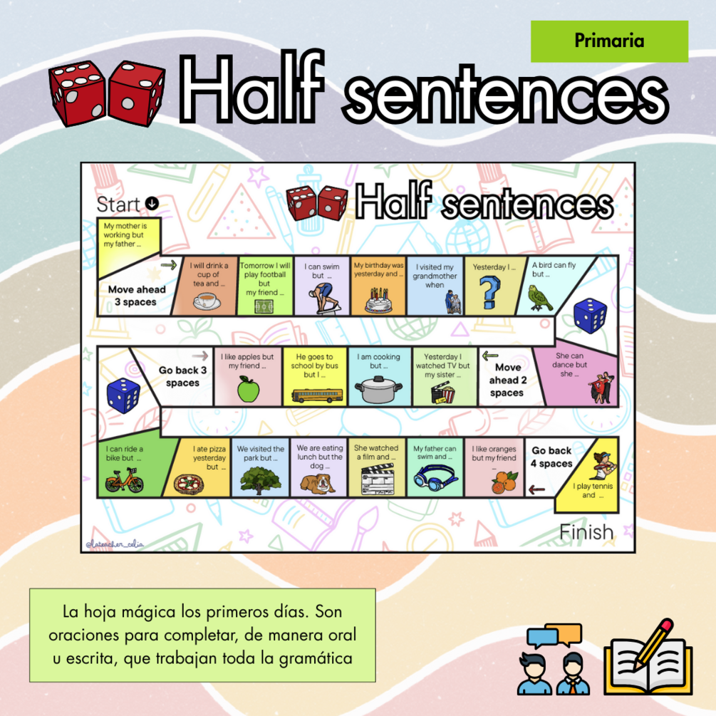 La hoja mágica los primeros días. Son oraciones para completar, de manera oral u escrita, que trabajan toda la gramática